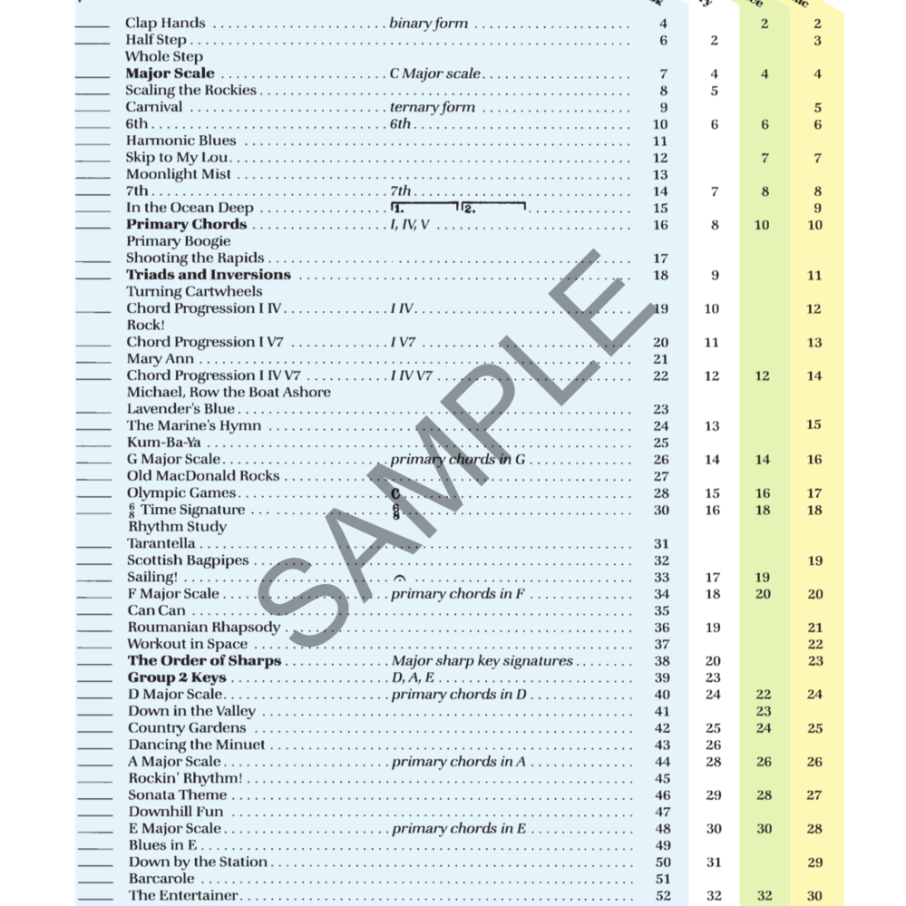 Level 2 presents binary and ternary form, one-octave scales with tetrachords identified, intervals of 6th and 7th, primary chords, triads and inversions, 6/8 time, and the keys of D, A, and E.