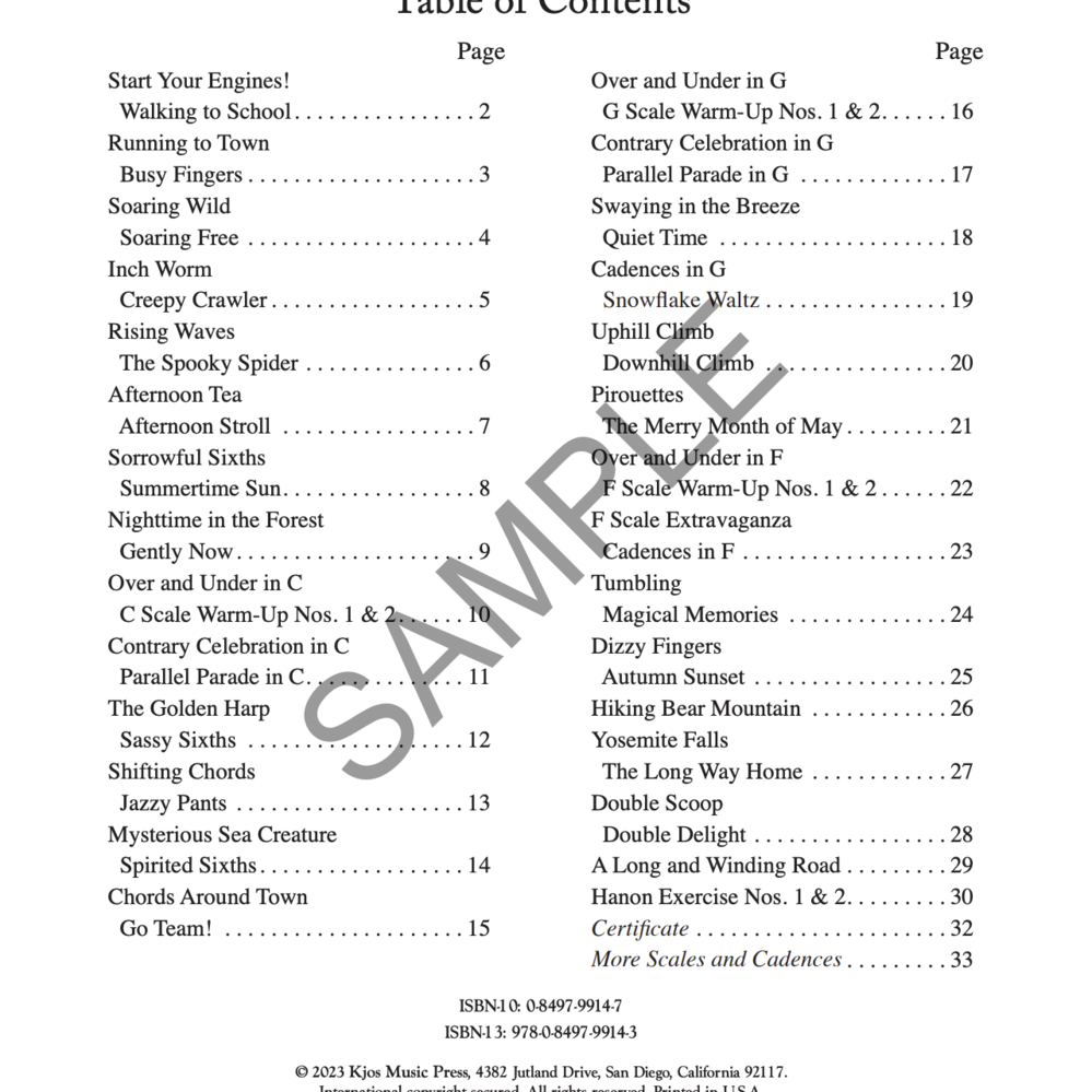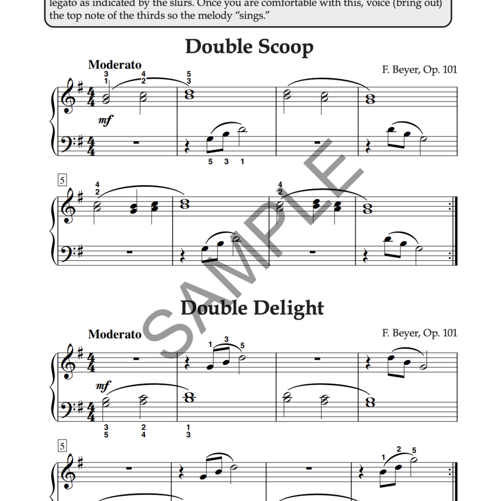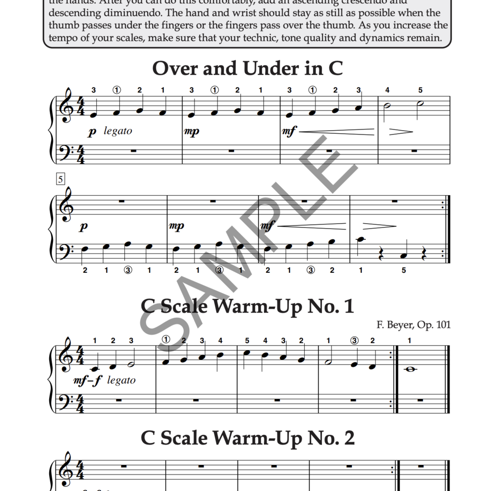 Exercises by the master 19th century pedagogues appear more frequently throughout this book than the previous levels. Many exercises are included that build the skills needed for hands-together playing, agility development, finger crossing skills (needed to play fulloctave scales), melodic and harmonic 6ths, as well as I chords, inverted IV and V7 chords for cadences. Also included are hand-over-hand exercises and early experiences in voicing some notes louder than others within a series of eighth notes. Includes 58 exercises on 32 pages.