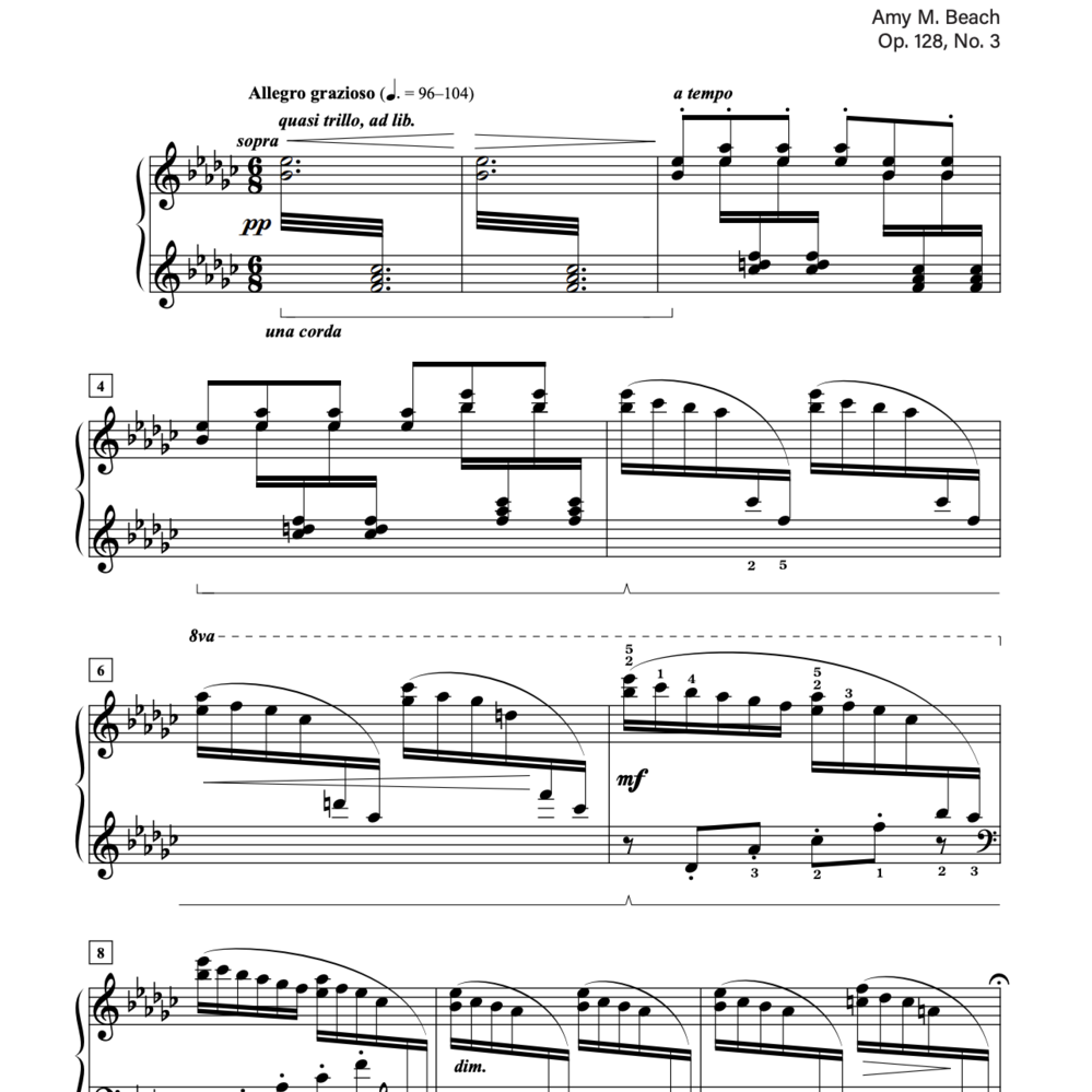 Composed in 1928, Amy Beach’s Three Pieces, Op. 128 mark a stylistic shift from the lush Romanticism of her earlier works. With transparent textures and more modern harmonic language, these pieces reflect a refined, forward-looking voice. Despite their subtlety, Beach cherished them deeply — performing the set twice at the White House, in 1934 and 1936.