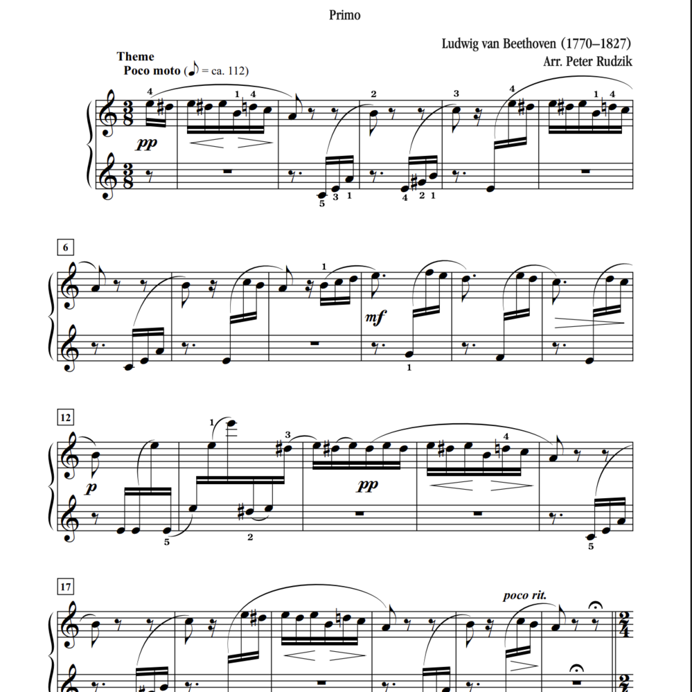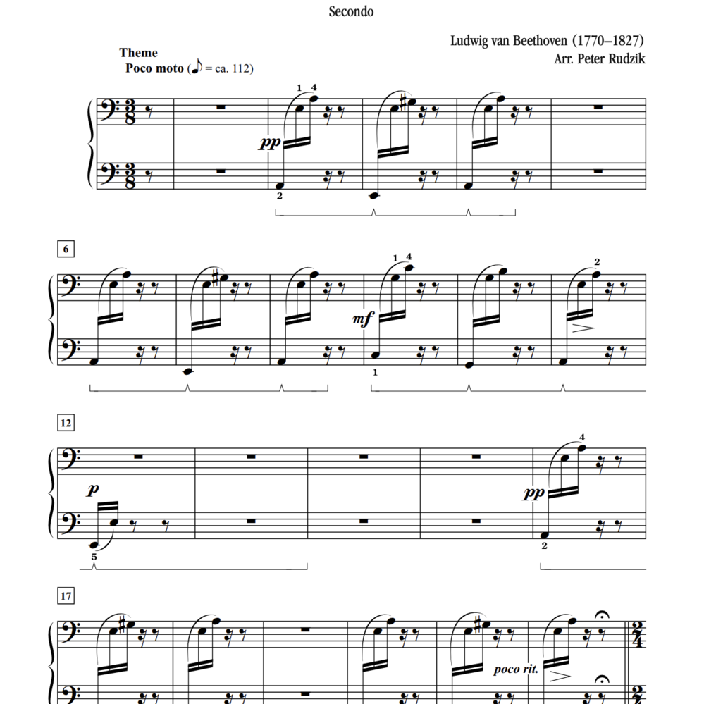 The well-known theme from Beethoven's Für Elise is divided between the primo and secondo in this intermediate-level duet. Three variations follow using fragments of the theme as a march, a waltz, and a brilliant chromatic showstopper. Students will be able to focus on different technical skills in each variation. This duet is sure to be a crowd-pleaser. A Federation Festivals 2020-2024 selection.
