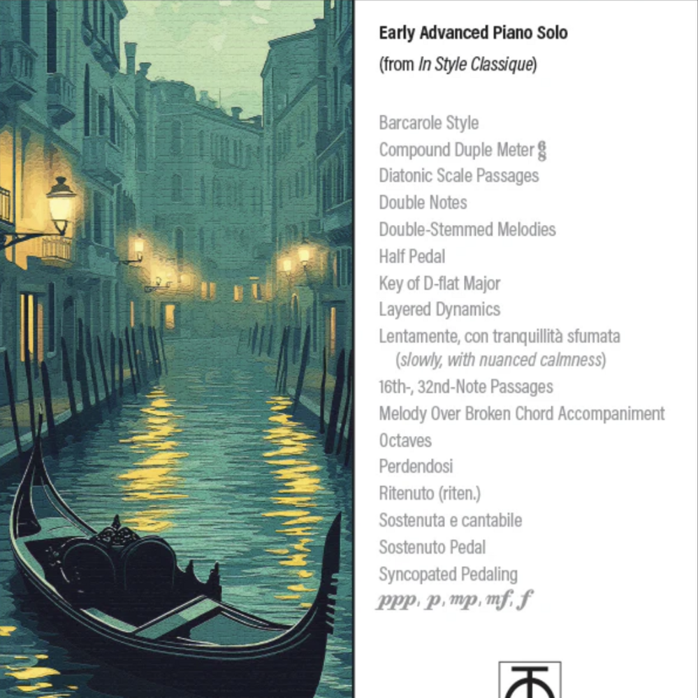 La Barcarola by Tom Gerou is an early advanced piano solo that captures the gentle rocking motion and lyrical charm of a Venetian gondolier’s song. Traditionally, a barcarole conveys the rhythmic sway of a boat through lilting compound duple meter, and Gerou’s composition beautifully mirrors this tranquil movement.