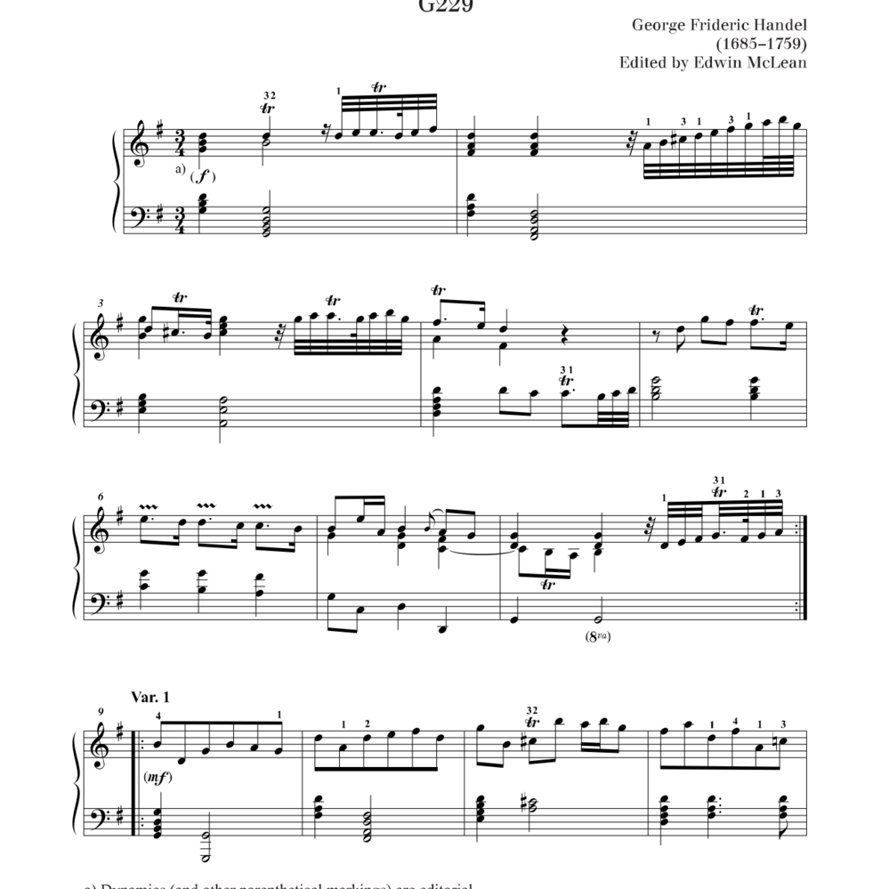 This masterpiece of the theme and variation form is one of Handel's best-known works for keyboard. It opens with a heroic theme and variations in G major, followed by a poignant, lyrical section of variations in G minor, and it concludes with a decisive return to G major.