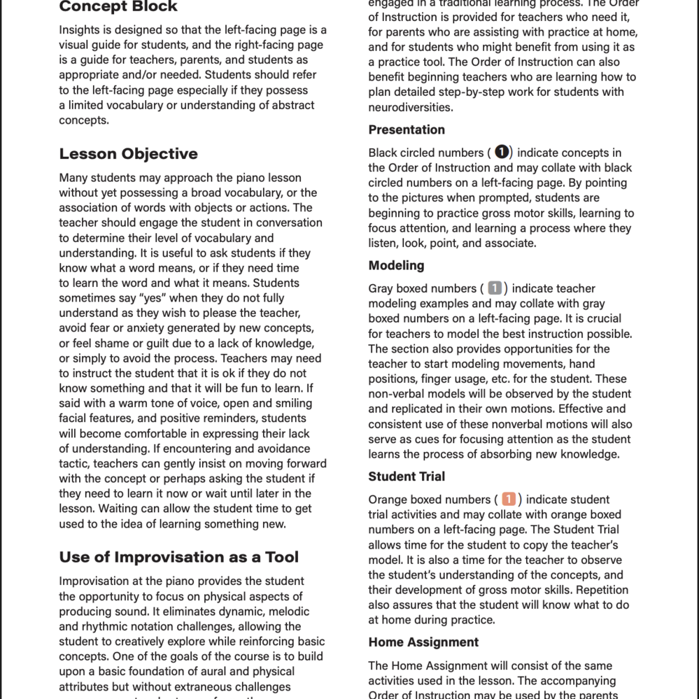 LEARN 1A introduces students to new concepts through a clear, visual lesson format designed to support understanding at the keyboard. Left-facing pages guide the student through each concept or exercise, while right-facing pages provide context and support for teachers, parents, and students as needed.
