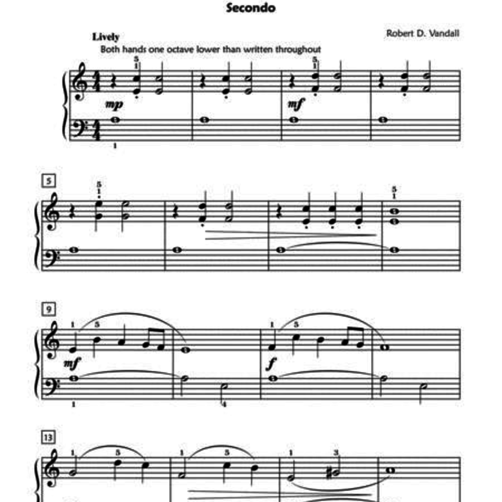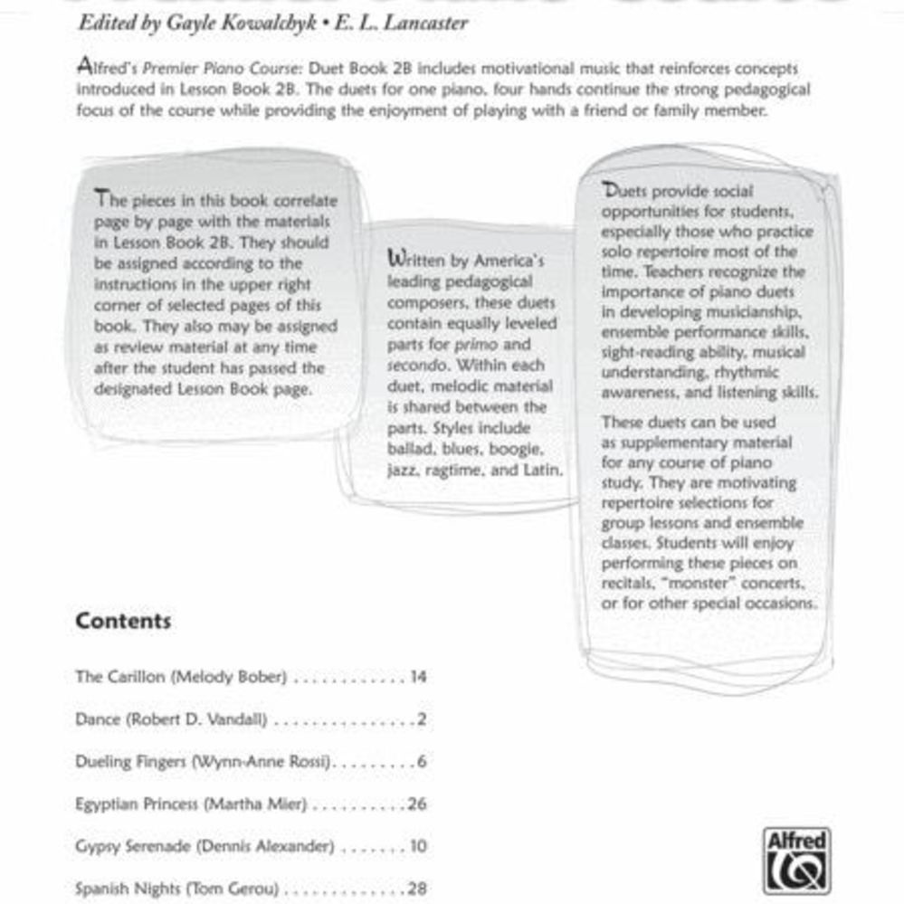 Alfred's Premier Piano Course: Duet 2B includes motivational music that reinforces concepts introduced in Lesson 2B. These duets for one piano, four hands continue the strong pedagogical focus of the course while providing the enjoyment of playing with a friend or family member. Written by America's leading pedagogical composers, these duets contain equally leveled parts for secondo and primo. Within each duet, melodic material is shared between the parts. Styles include ballad, blues, boogie, jazz, ragtime, and latin.