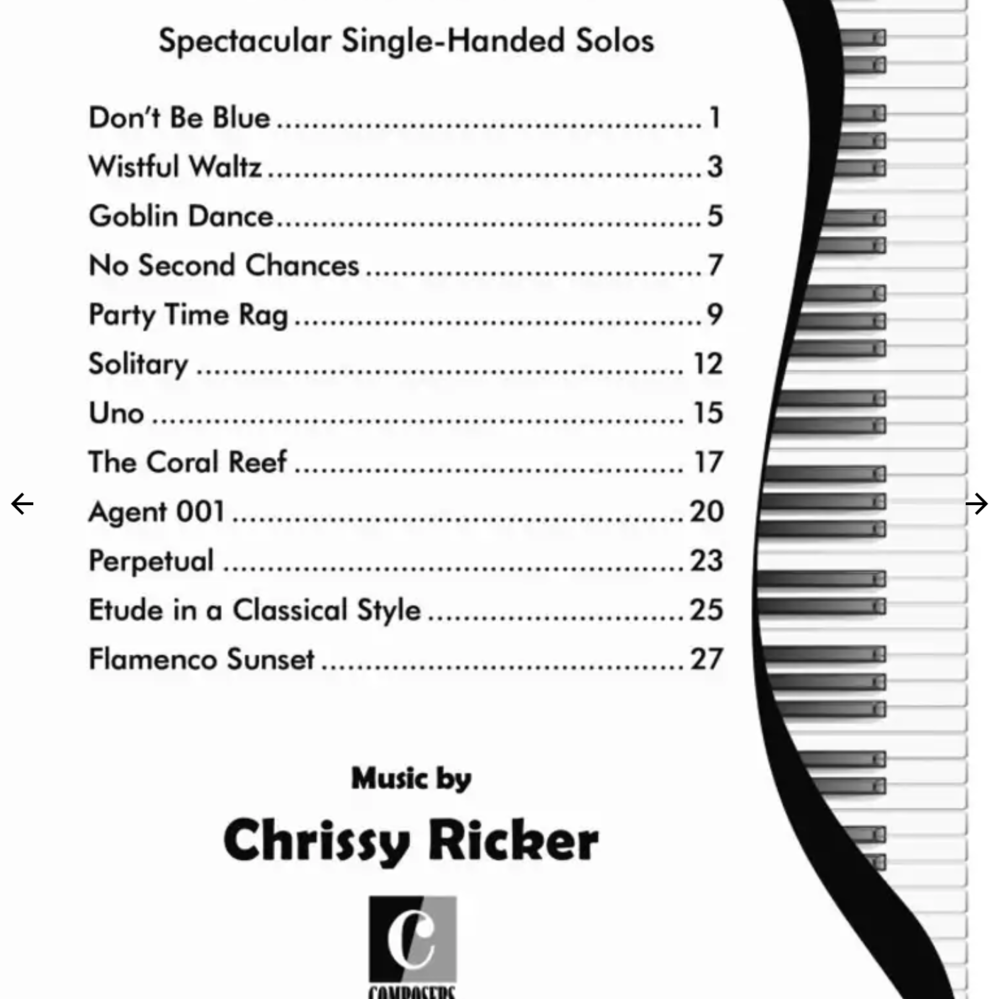 Hit Singles is the solution to the perennial “broken-arm conundrum” in your studio! This collection features twelve one-handed showcase solos which can be played with either the left or right hand. Music by Chrissy Ricker. This book contains selections for the NFMC Festivals Bulletin, 2020-2024.