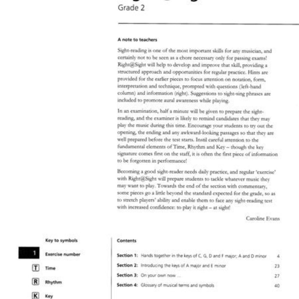 Right@Sight is based on musical material fromT.A. Johnson's celebrated Read and Play sight-reading series. Using an entirely new presentation, Caroline Evans brings a refreshingly direct approach to the development of this vital musical skill. Eachexercise takes as its starting point TRaK – Time, Rhythm and Key. Helpful and imaginativeguidance encourages the student to meet the various practical and interpretative challenges introduced in each new piece. Conveniently presented in 8 progressive volumes corresponding to examination grades, Right@Sight is the only sight-reading course you are likely to need.