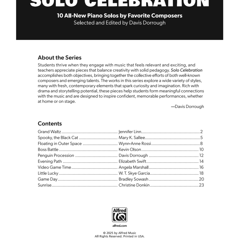 This vibrant, six-book series showcases ten original piano solos in each book, bringing together the creative work of many well-known composers and rising talents. Spanning the early-elementary to late-intermediate levels, Solo Celebration highlights a variety of styles with fresh, contemporary elements that spark curiosity and imagination. Composers include W. T. Skye Garcia, Jennifer Linn, Kevin Olson, Wynn-Anne Rossi, and more! Book 1 features music for early-elementary pianists.