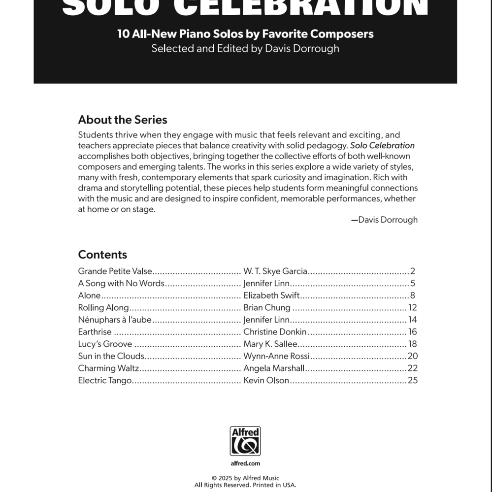 This vibrant six-book series showcases 10 original piano solos in each book, bringing together the creative work of many well-known composers and rising talents. Spanning the early-elementary to late-intermediate levels, Solo Celebration highlights a variety of styles with fresh, contemporary elements that spark curiosity and imagination. Composers include W. T. Skye Garcia, Jennifer Linn, Kevin Olson, Catherine Rollin, Wynn-Anne Rossi, and more! Book 5 features music for intermediate pianists.