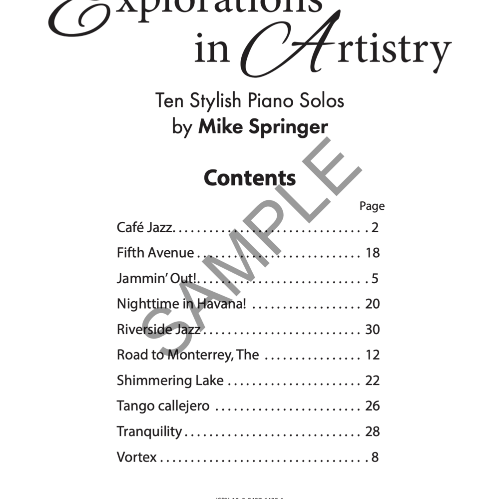 Explorations in Artistry, Late Intermediate, is a unique collection of 10 solos, each having a distinct sound and texture allowing students to explore the artistic elements appropriate to its style. Students can explore the street tango style from Argentina in Tango callejero or the montuno (contradanza) rhythms of Cuba in Nighttime in Havana. With the fun boogie style of Jammin' Out, the high-energy big band sounds of Riverside Jazz, the sweeping arpeggios in the dramatic show-stopper, Vortex, or the peaceful and mesmerizing sounds of Shimmering Lake, this collection will delight students and teachers alike with its variety and opportunities for artistry.