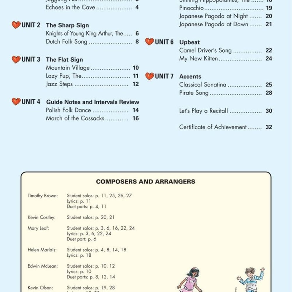 The Recital Book offers outstanding repertoire for recitals and fun! The pieces feature a variety of styles in varying keys, reinforcement of reading and skills presented in the Lesson and Technique Book. Some of the popular titles are: The Lazy Pup; Jazz Steps; Camel Driver’s Song; and Pirate Song. Practice steps and musicality questions help students learn to listen and enjoy music. This book is an ideal supplement to any method. Free downloads of all tracks are available at www.fjhmusic.com/downloads.