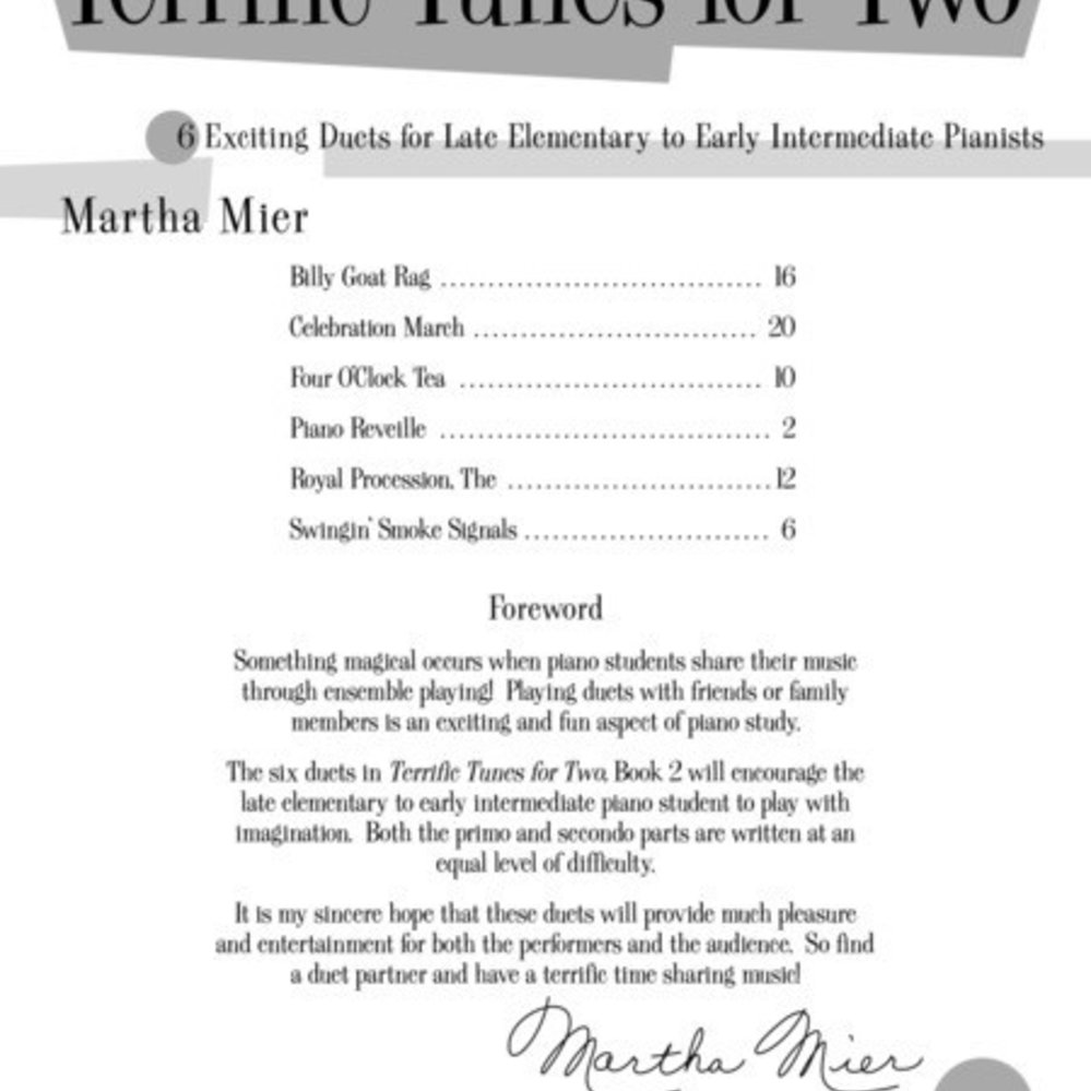 Playing duets with friends or family members is an exciting and fun aspect of piano study. The duets in Terrific Tunes for Two will encourage students to play with imagination. Both the primo and secondo parts are written at an equal level of difficulty. Book 2 has six duets for late elementary to early intermediate pianists and correlates with Alfred's Basic Piano Level 2-3.
